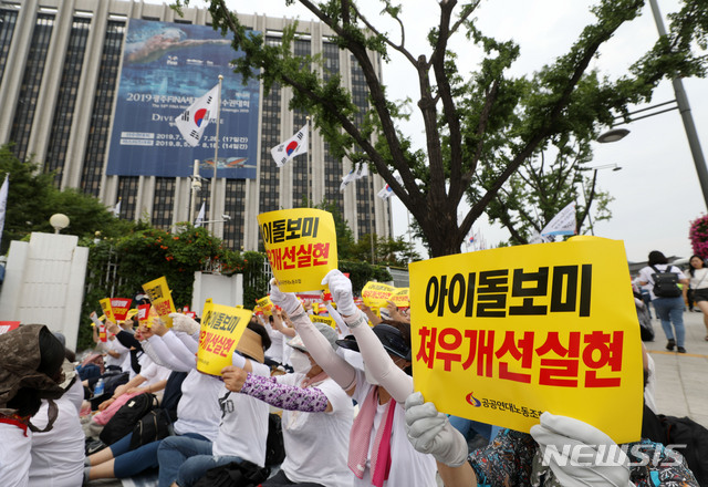 【서울=뉴시스】홍효식 기자 = 3일 오후 서울 종로구 정부서울청사 정문 앞에서 공공연대노조원들이 진짜 사용자 여성가족부 규탄 및 전국 아이돌보미 처우개선을 위한 총파업대회에서 구호를 외치고 있다. 2019.07.03.