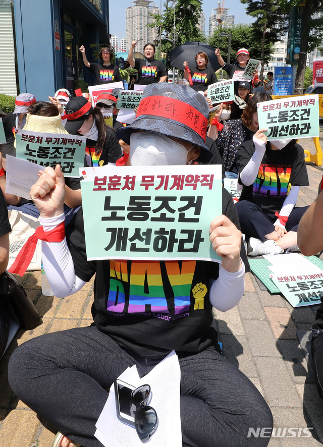 【서울=뉴시스】이영환 기자 = 4일 오전 서울 용산구 서울지방보훈청 앞에서 공공운수노조 사회복지지부 국가보훈처보훈복지사지회 조합원들이 결의대회를 열고 보훈복지사 처우 개선을 촉구하고 있다. 2019.07.04.