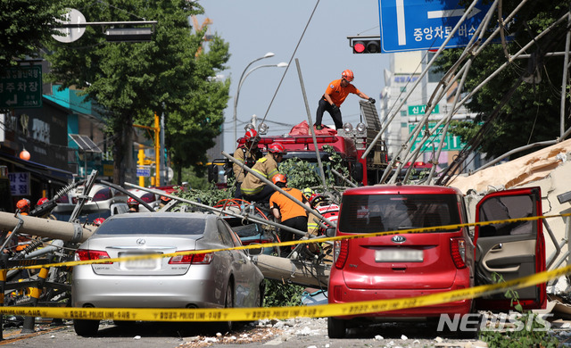 【서울=뉴시스】김선웅 기자 = 4일 오후 서울 서초구 잠원동의 한 철거 중인 건물 외벽이 붕괴하는 사고가 발생했다. 인근 차량이 사고 영향으로 넘어진 전신주에 깔려 있다. 2019.07.04.