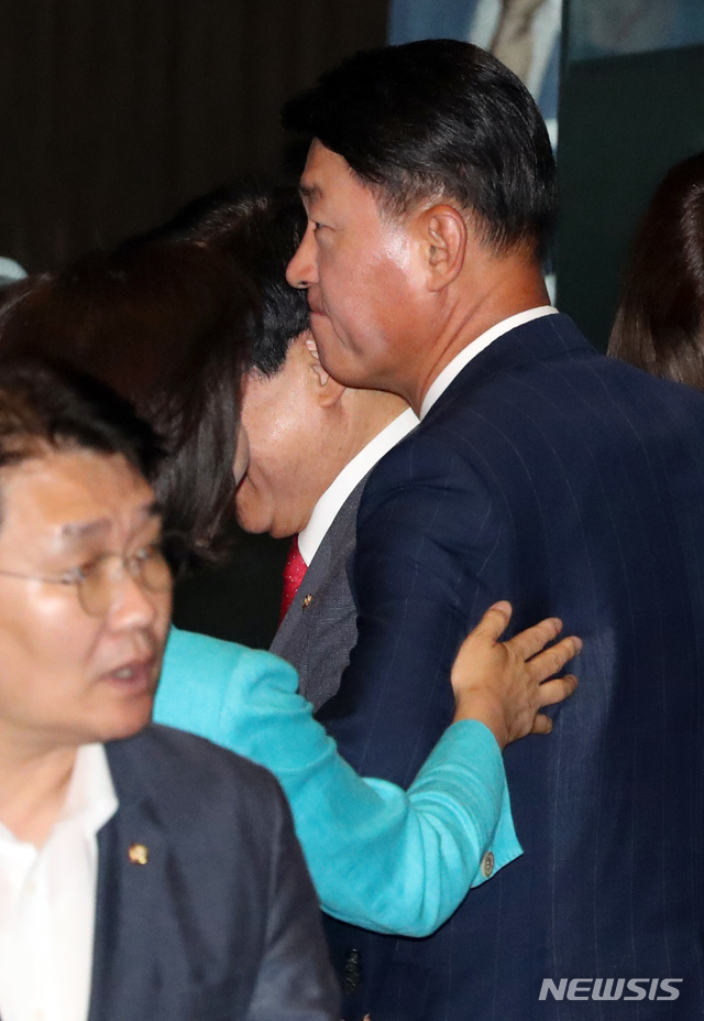 【서울=뉴시스】 박영태 기자 = 5일 오전 서울 여의도 국회 본회의장에서 열린 제369회 국회(임시회) 제5차 본회의에서 나경원 자유한국당 원내대표가 상임위원장 투표를 위해 줄 서 있는 황영철 의원의 어깨를 치고 있다. 2019.07.05.
