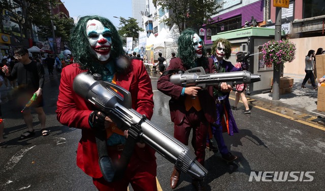 【서울=뉴시스】 고범준 기자 = 6일 오후 서울 서대문구 신촌 연세로 일대에서 열린 '제7회 신촌물총축제'에 참여한 시민들이 이색복장을 하고 물총을 들고 있다.