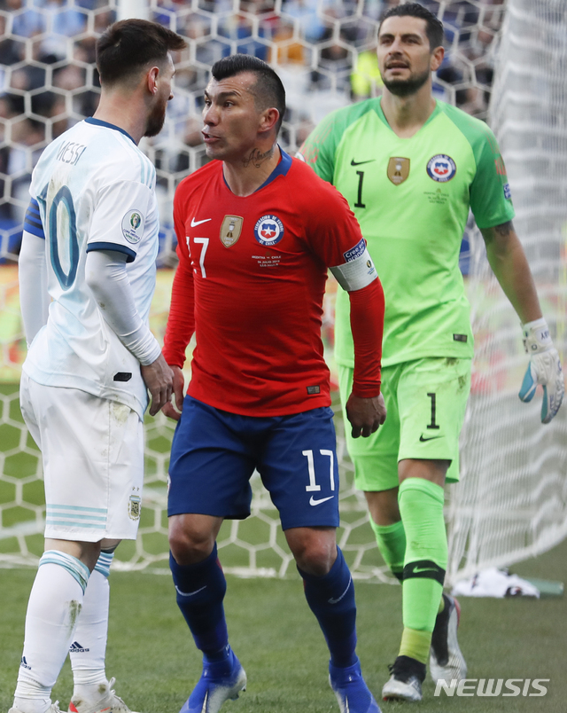 【상파울루=AP/뉴시스】리오넬 메시(아르헨티나, 왼쪽)가 6일(현지시간) 브라질 상파울루의 아레나 코린치안스에서 열린 2019 코파 아메리카 칠레와의 3-4위전에서 게리 메델(칠레)와 언쟁을 벌이고 있다.