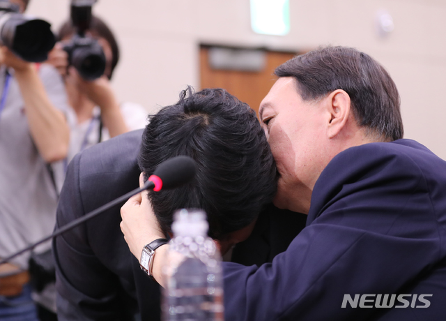 【서울=뉴시스】 전진환 기자 = 윤석열 검찰총장 인사청문회가 열린 8일 오후 서울 여의도 국회 법제사법위원회 회의실에서 야당의원들의 자료요처을 받은 윤 후보자가 검찰 관계자를 불러 무언가를 이야기하고 있다. 2019.07.08.