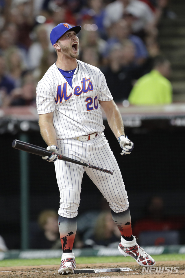 【클리블랜드=AP/뉴시스】뉴욕 메츠의 피트 알론소가 8일(현지시간) 미 오하이오주 클리블랜드의 프로그레시브 필드에서 열린 메이저리그 올스타전 홈런더비에 출전해 자신의 타구를 바라보며 포효하고 있다.