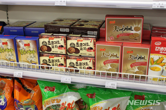 【서울=뉴시스】박진희 기자 = 대성백화점 1층 슈퍼마켓 과자 매장에서 판매되는 과자 제품과 가격. 북한 원화(내화)의 현재 시장환율은 1달러 당 8,500원이다. 2019.07.09. (사진=평화경제연구소 제공)