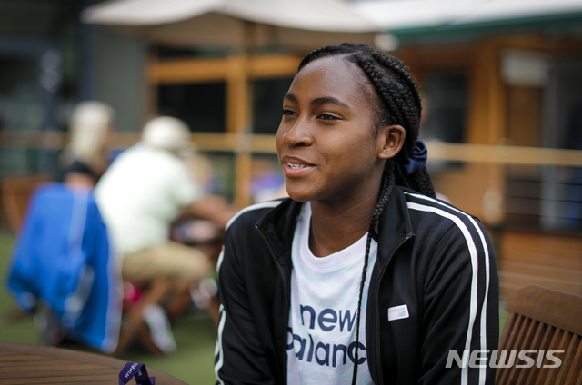 【런던=AP/뉴시스】올해 윔블던 테니스대회 최고의 돌풍을 일으켰던 미국의 코리 "코코' 가우프가 9일(현지시간) 영국 런던 윔블던의 올잉글랜드클럽에서 AP 통신과 인터뷰하고 있다.