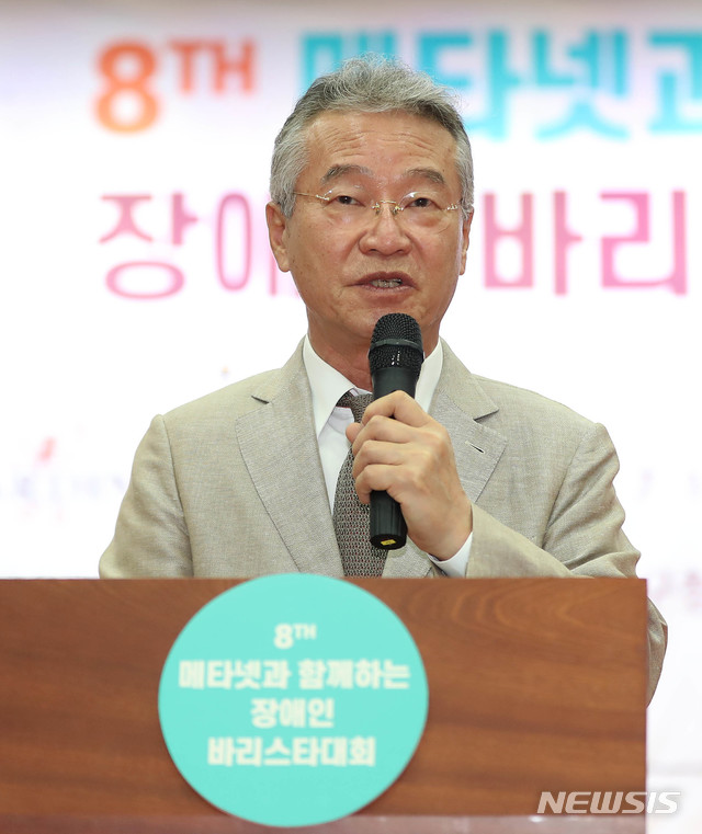 【서울=뉴시스】추상철 기자 = 원두커피 전문기업 쟈뎅이 공식 협찬한 제8회 메타넷과 함께하는 장애인 바리스타 대회가 열린 10일 오후 서울 서대문구청 대강당에서 한국재활재단 이사장인 윤영노 쟈뎅 회장이 인사말을 하고 있다. 2019.07.10.