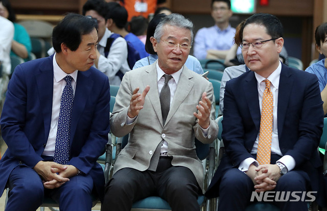 【서울=뉴시스】추상철 기자 = 원두커피 전문기업 쟈뎅이 공식 협찬한 제8회 메타넷과 함께하는 장애인 바리스타 대회가 열린 10일 오후 서울 서대문구청 대강당에서 한국재활재단 이사장인 윤영노(왼쪽 두번째) 쟈뎅 회장이 문석진(왼쪽) 서대문 구청장, 박정식 메타넷글로벌 대표와 함께 대화하고 있다. 2019.07.10.