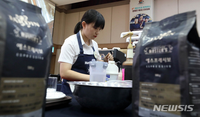【서울=뉴시스】추상철 기자 = 원두커피 전문기업 쟈뎅이 공식 협찬한 제8회 메타넷과 함께하는 장애인 바리스타 대회가 열린 10일 오후 서울 서대문구청 대강당에서 장애인 바리스타가 그동안 갈고 닦은 솜씨를 선보이고 있다. 2019.07.10.