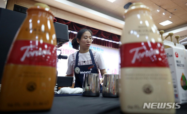 【서울=뉴시스】추상철 기자 = 원두커피 전문기업 쟈뎅이 공식 협찬한 제8회 메타넷과 함께하는 장애인 바리스타 대회가 열린 10일 오후 서울 서대문구청 대강당에서 장애인 바리스타가 그동안 갈고 닦은 솜씨를 선보이고 있다. 2019.07.10.