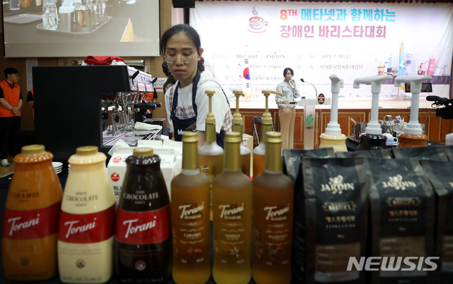 【서울=뉴시스】추상철 기자 = 원두커피 전문기업 쟈뎅이 공식 협찬한 제8회 메타넷과 함께하는 장애인 바리스타 대회가 열린 10일 오후 서울 서대문구청 대강당에서 장애인 바리스타가 그동안 갈고 닦은 솜씨를 선보이고 있다. 2019.07.10.