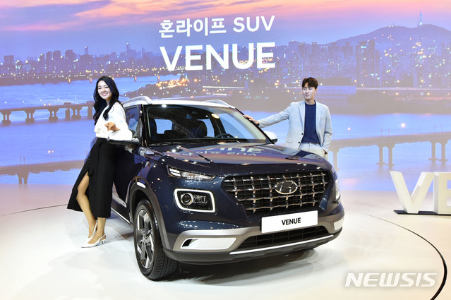 【용인=뉴시스】 김종택 기자 = 11일 오전 경기도 용인시 기흥구 소재 더 카핑(The Carffing)에서 열린 현대자동차 '베뉴(VENUE)출시 행사에서 모델들이 포즈를 취하고 있다. 2019.07.11.