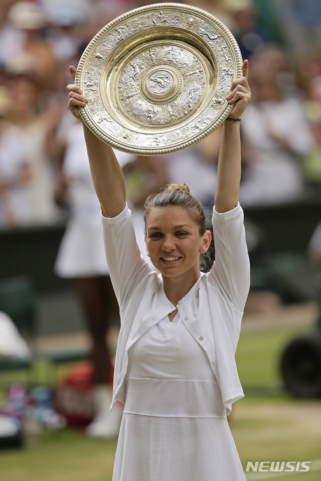 【런던=AP/뉴시스】시모나 할레프(7위·루마니아)가 13일(현지시간) 영국 런던 윔블던의 올잉글랜드클럽에서 열린 2019 윔블던 테니스대회 여자 단식에서 세리나 윌리엄스(10위·미국)를 꺾고 우승, 트로피를 들고 포즈를 취하고 있다.