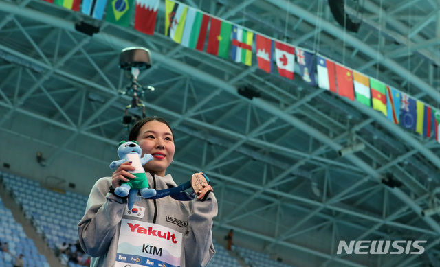 【광주=뉴시스】이영환 기자 = 13일 오후 광주 광산구 남부대학교 시립국제수영장에서 열린 2019 광주세계수영선수권대회 여자 1m 스프링보드 결승, 동메달을 획득한 한국 김수지가 포즈를 취하고 있다. 2019.07.13.