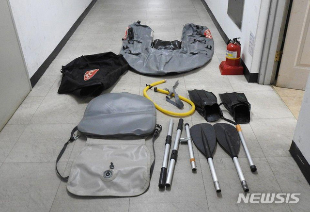 사진은 거동수상자 수색 중 해군 2함대 내에서 발견된 고무보트·오리발·패들(노). 2019.07.14. (사진=국방부 제공) [email protected]