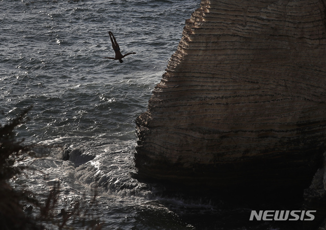 【베이루트(레바논)=AP/뉴시스】14일(현지시간) 레바논 베이루트에서 레드불 클리프 다이빙 월드 시리즈가 열려 한 다이버가 레바논의 명소 라우시 바위에서 뛰어내리고 있다.
