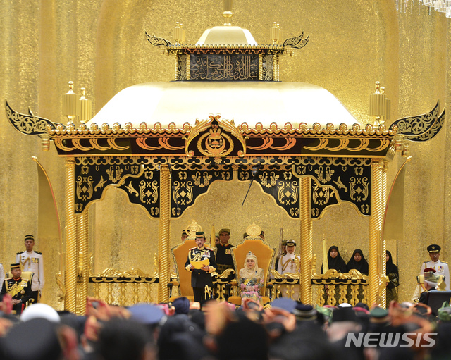 【반다르스리브가완(브루나이)=AP/뉴시스】15일(현지시간) 브루나이 수도 반다르스리브가완에서 군 복장을 한 하사날 볼키아 브루나이 술탄(왼쪽)이 자신의 73번째 생일 축하 행사 중 참석자들에게 연설하고 있다. 2019.07.15.