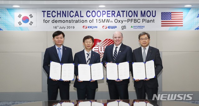 【울산=뉴시스】조현철 기자 = 한국동서발전은 16일 동해바이오화력본부에서 미국의 GTI, 한전 전력연구원, 현대중공업파워시스템과 함께 순산소 가압유동층 복합발전 기술실증 협력 업무협약을 체결했다. 2019.07.16. (사진=한국동서발전 제공)