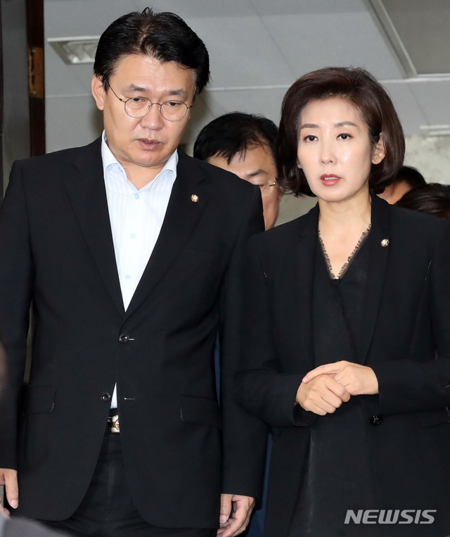 【서울=뉴시스】 박영태 기자 = 16일 오전 서울 여의도 국회에서 열린 자유한국당 원내대책회의에 나경원 원내대표가 정용기 정책위의장과 이야기를 나누며 참석하고 있다. 2019.07.16.