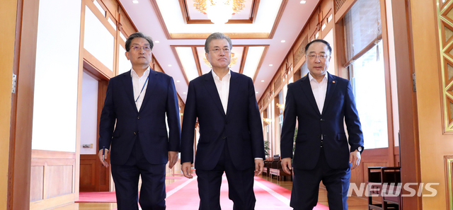 【서울=뉴시스】전신 기자 = 문재인 대통령이 16일 청와대 본관에서 열린 국무회의에 참석하고 있다. 왼쪽부터 노영민 비서실장, 문 대통령, 홍남기 경제부총리. 2019.07.16.