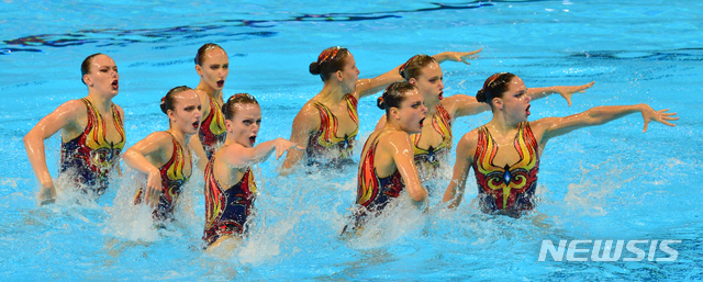 【광주=뉴시스】 변재훈 기자 = 17일 광주 서구 염주체육관 아티스틱수영경기장에서 열린 2019 광주세계수영선수권대회 아티스틱 수영 팀 프리 예선 경기, 러시아 대표팀이 연기를 선보이고 있다. 2019.07.17.