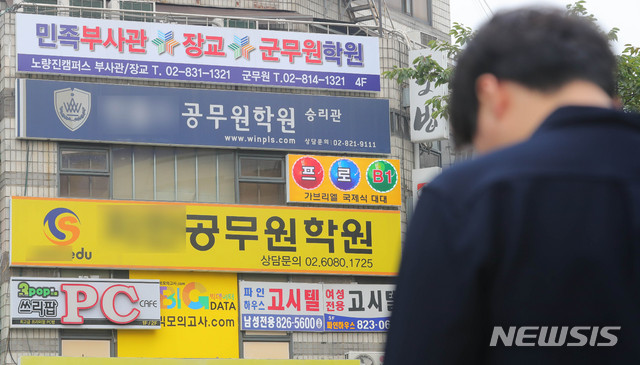 【서울=뉴시스】배훈식 기자 = 2019년 5월 청년층(15~29세) 부가조사 결과 취업준비생이 71만4000여명 중 약 30%가 공무원 시험을 준비하는 것으로 나타났다. 사진은 17일 오후 서울 동작구 노량진 학원가 모습. 2019.07.17.