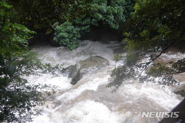푹우로 물이 넘쳐나고 있는 제주시 방선문 계곡