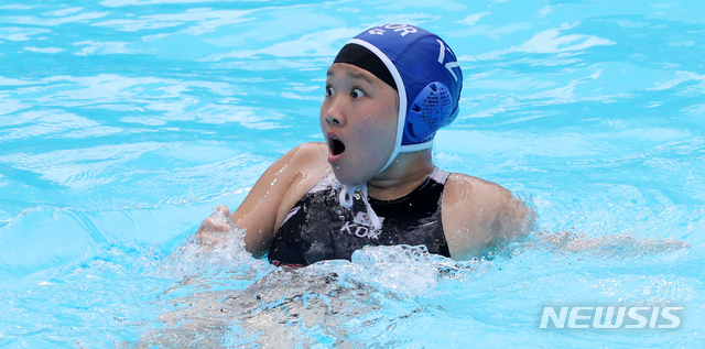 【광주=뉴시스】 고범준 기자 = 20일 오전 광주 광산구 남부대학교 수구경기장에서 열린 2019 광주세계수영선수권대회 여자 수구 크로스오버매치 대한민국-남아프리카 공화국 경기, 한국 조예림(12번)이 골을 넣고 놀라워 하고 있다. 2019.07.20.