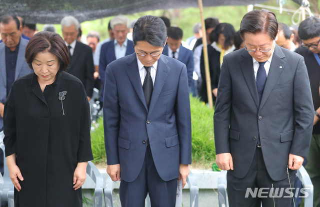 【남양주=뉴시스】배훈식 기자 = 20일 오전 경기 남양주시 모란공원묘지에서 열린 故 노회찬 의원 서거 1주기 추모제 및 묘비제막식에 참석한 심상정(왼쪽부터) 정의당 대표, 윤소하 원내대표, 이재명 경기지사가 묵념하고 있다. 2019.07.20.