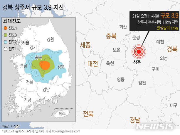 【서울=뉴시스】기상청에 따르면 21일 오전 11시4분께 경북 상주시 북북서쪽 11㎞ 지역에서 규모 3.9의 지진이 발생했다.  (그래픽=안지혜 기자)