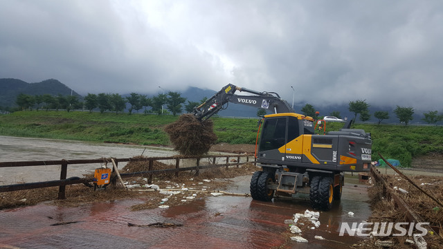 【밀양=뉴시스】안지율 기자 = 제5호 태풍 다나스의 영향으로 폭우가 내리는 21일 오전 경남 밀양시 삼문동 나노교 건설공사장에 집중호우로 인해 떠내려온 각종 쓰레기를 시행사인 밀양시와 시공사인 주식회사 한양이 포크레인을 이용해 쓰레기를 수거하고 있다. 2019.07.21.