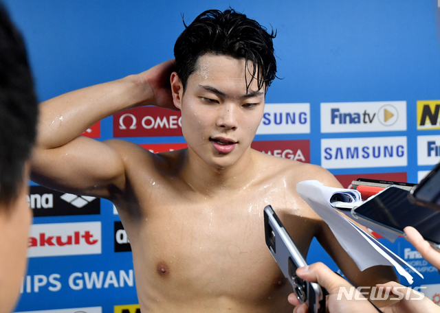 【광주=뉴시스】신대희 기자 = 21일 광주 광산구 남부대학교 시립국제수영장에서 열린 2019 광주 세계수영선수권대회 남자 자유형 400m 예선에서 47명 중 22위(3분51초89)를 차지한 이호준(18·영훈고)이 믹스트존에서 인터뷰를 하고 있다. 2019.07.21.