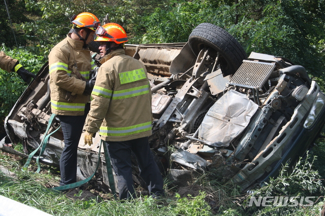 【삼척=뉴시스】김태식 기자 = 22일 강원 삼척시 가곡면의 한 도로에서 승합차가 전복돼 4명이 숨지고 12명이 중경상을 입는 사고가 발생한 가운데 출동한 소방대원들이 인명구조와 함께 차량을 견인하고 있다.2019.07.22.
