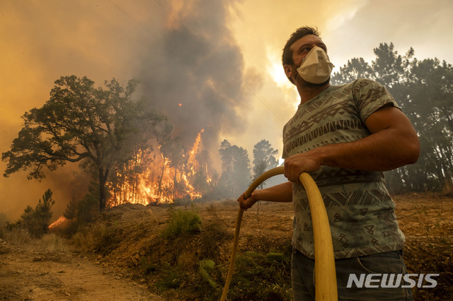 【마카오(포르투갈)=AP/뉴시스】22일(현지시간) 포르투갈 중부 마카오 인근 마을에서 한 주민이 호스를 들고 산불을 끄기 위해 애쓰고 있다.