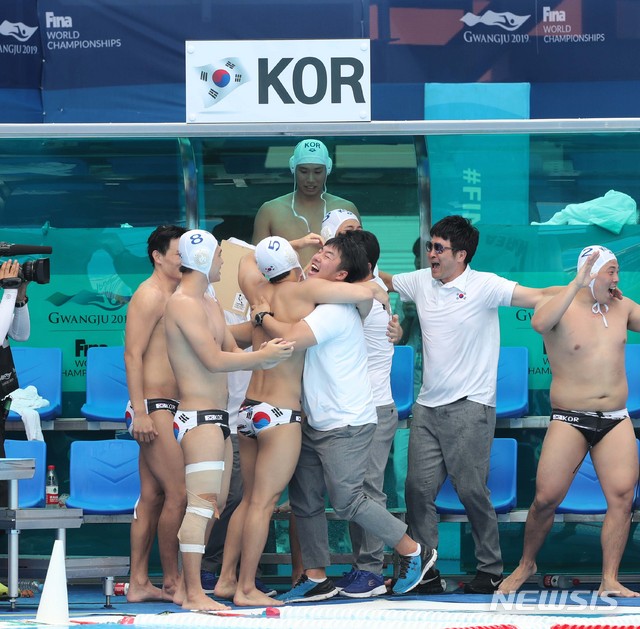 【광주=뉴시스】 고범준 기자 = 23일 오전 광주 광산구 남부대학교 수구경기장에서 열린 2019 광주세계수영선수권대회 남자 수구 대한민국-뉴질랜드의 15~16위 순위결정전 경기, 한국 대표팀이 승리를 거두자 기뻐하고 있다.