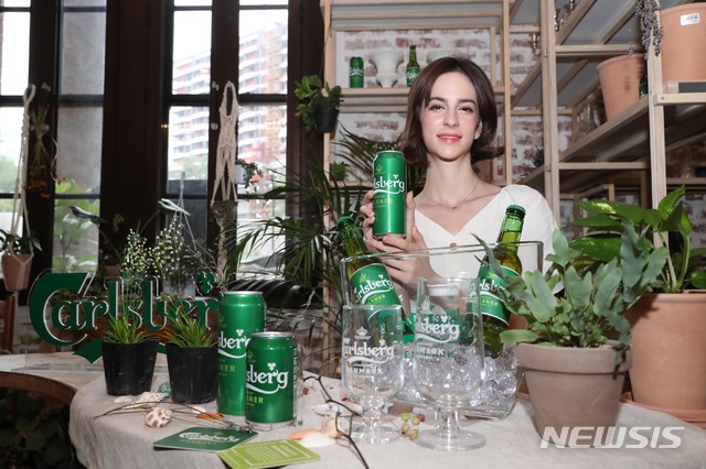 【서울=뉴시스】25일 서울 중구 정동 정동1928 아트센터에서 열린 미디어 컨퍼런스에서 덴마크 왕실 공식 지정 맥주 ‘칼스버그 대니쉬 필스너’를 들고 모델들이 포즈를 취하고 있다. 2019.07.25. (사진=골든블루 제공)