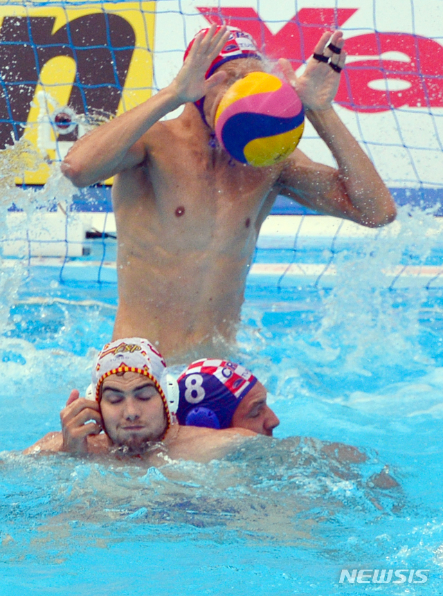 【광주=뉴시스】변재훈 기자 = 25일 오후 광주 광산구 남부대학교 수구경기장에서 열린 광주세계수영선수권대회 남자 수구 준결승 스페인-크로아티아 경기에서 크로아티아 골키퍼 마르코 비자크가 투혼을 발휘해 가까스로 공을 막아내고 있다. 2019.07.25.