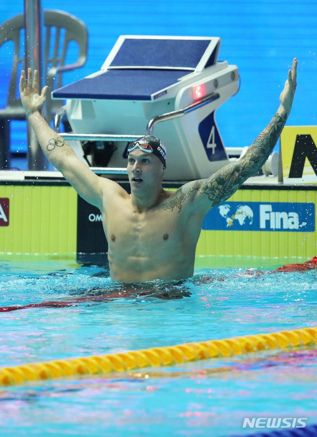 【광주=뉴시스】 고범준 기자 = 25일 오후 광주 광산구 남부대학교 시립국제수영장에서 열린 2019 광주세계수영선수권대회 경영 남자 자유영100m 결승 경기, 금메달을 차지한 미국 카엘렙 드레셀이 기뻐하고 있다. 2019.07.25.