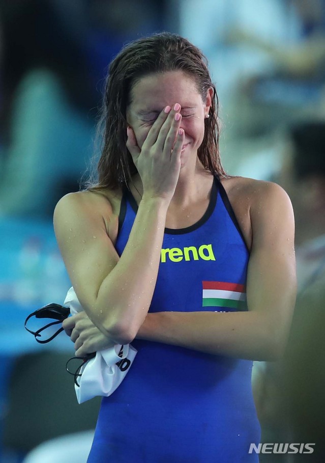 【광주=뉴시스】 고범준 기자 = 25일 오후 광주 광산구 남부대학교 시립국제수영장에서 열린 2019 광주세계수영선수권대회 경영 여자 접영200m 결승 경기, 금메달을 차지한 헝가리 보그라르카 카파스가 기뻐하고 있다. 2019.07.25.