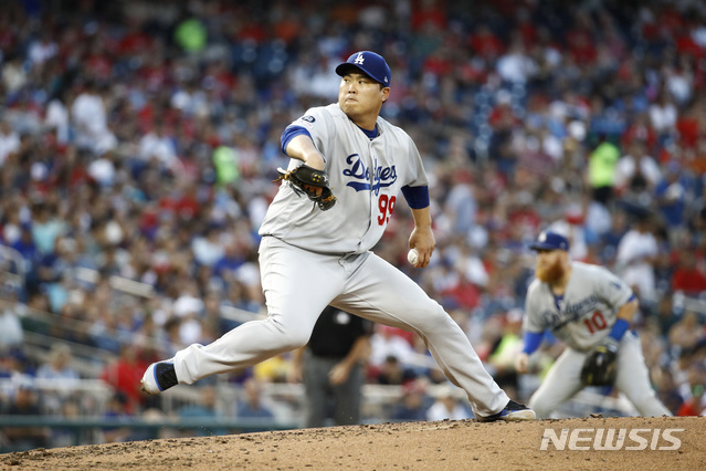 【워싱턴=AP/뉴시스】LA 다저스 류현진이 26일(한국시각) 미 워싱턴 D.C. 내셔널스 파크에서 열린 2019 메이저리그 워싱턴 내셔널스와의 원정경기에 선발 등판해 3회 투구하고 있다.