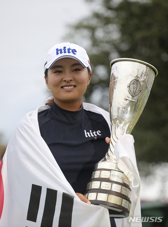 【에비앙레뱅(프랑스)=AP/뉴시스】고진영이 28일(현지시간) 프랑스 에비앙레뱅의 에비앙 리조트 골프클럽에서 막을 내린 시즌 네 번째 메이저 대회 LPGA 에비앙챔피언십에서 우승, 태극기를 두른 채 트로피를 들고 포즈를 취하고 있다.