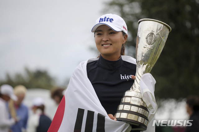 【에비앙레뱅(프랑스)=AP/뉴시스】고진영이 28일(현지시간) 프랑스 에비앙레뱅의 에비앙 리조트 골프클럽에서 막을 내린 시즌 네 번째 메이저 대회 LPGA 에비앙챔피언십에서 우승, 트로피를 들고 포즈를 취하고 있다.