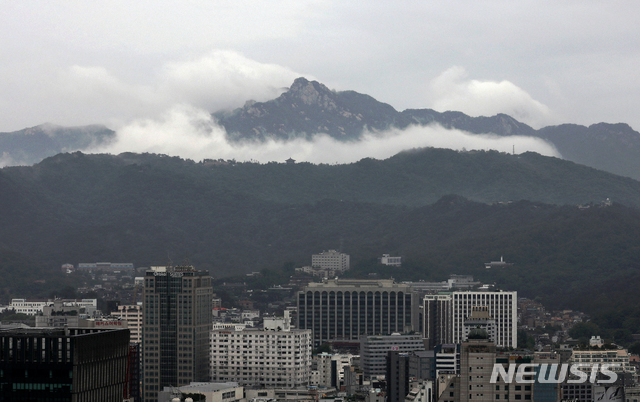 【서울=뉴시스】김병문 기자 = 소멸된 제8호 태풍 '프란시스코(FRANCISCO)'의 영향으로 비가 내리는 7일 오전 서울 종로구 도심 뒤로 운해가 내려앉은 북한산이 보이고 있다. 2019.08.07.