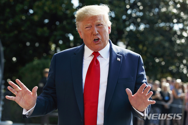 【워싱턴=AP/뉴시스】도널드 트럼프 미국 대통령이 9일(현지시간) 미 뉴저지주 소재 자신의 골프클럽으로 휴가를 떠나기 전 백악관 사우스론에서 기자들과 얘기를 나누고 있다.