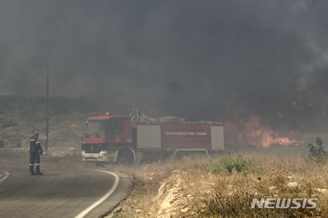【엘라포니소스(그리스)=AP/뉴시스】10일(현지시간) 그리스 펠로폰네소스 반도 남쪽 엘라포니소스 섬에서 불이 나 소방대원들이 현장에서 불을 끄고 있다.