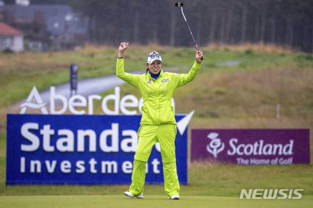 【노스베릭=AP/뉴시스】허미정이 11일(현지시간) 스코틀랜드 노스 베릭 더 르네상스 클럽에서 열린 LPGA 투어 애버딘 스탠다드 인베스트먼츠 레이디스 스코티시 오픈 최종라운드 마지막 홀에서 우승을 확정하는 버디를 기록하며 환호하고 있다.
