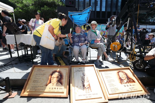 【서울=뉴시스】김선웅 기자 = 세계 일본군 위안부 기림일이자 74주년 광복절을 하루 앞둔 14일 오후 서울 종로 옛 주한일본대사관 앞에서 열린 1400차 일본군 성노예제 문제해결을 위한 정기 수요집회에 참석한 길원옥 할머니가 세월호 참사 희생자 가족과 인사하고 있다. 2019.08.14.