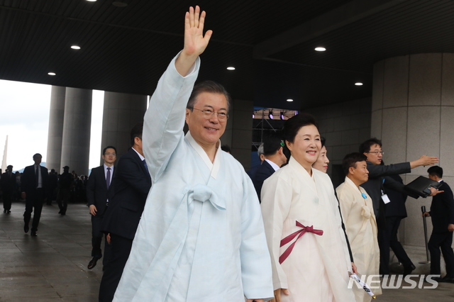 【천안=뉴시스】박진희 기자 = 문재인 대통령과 부인 김정숙 여사가 15일 충남 천안시 독립기념관에서 열린 제74회 광복절 경축식을 마치고 나서며 손을 흔들며 인사하고 있다. 2019.08.15.