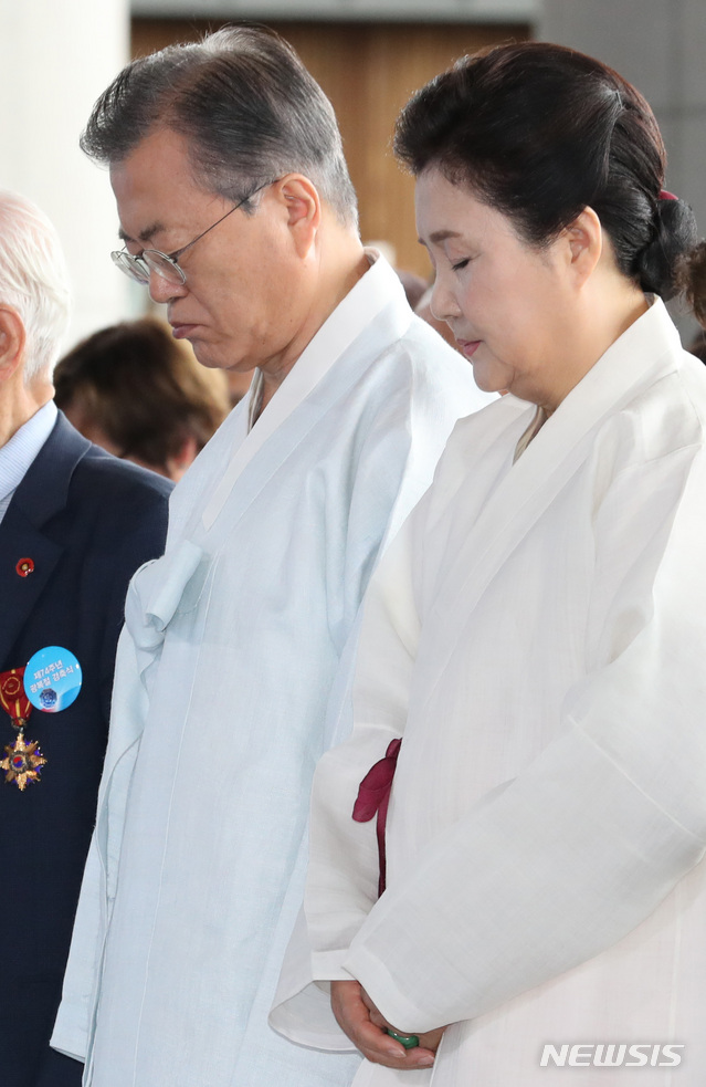 【천안=뉴시스】박진희 기자 = 문재인 대통령과 김정숙 여사가 15일 오전 천안 독립기념관 겨레의 집에서 열린 제74주년 광복절 경축식에서 내빈들과 함께 순국선열 및 호국영령에 대한 묵념을 하고 있다. 2019.08.15.