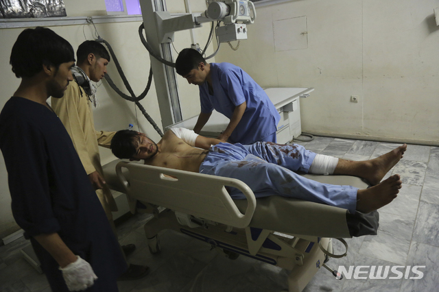 【카불=AP/뉴시스】17일 밤(이하 현지시간) 아프가니스탄 수도 카불의 두바이시티 예식장에서 자살폭탄 테러가 일어나 18일 새벽 한 부상 남성이 병원에서 치료를 받고 있다.